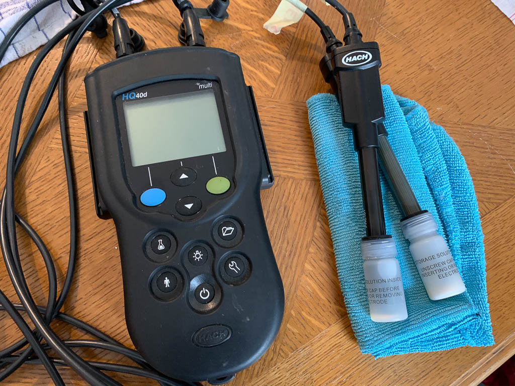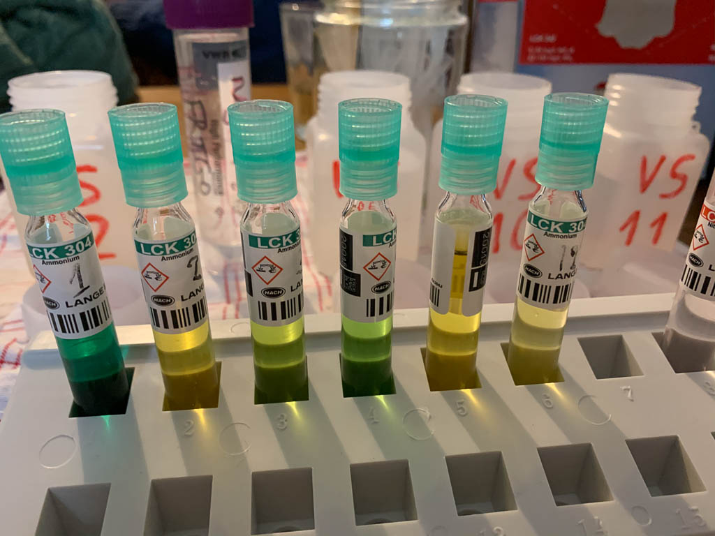 Dans les heures qui suivent le prélèvement, nous dosons des parts d'échantillons dans trois réactifs différents, que nous passons ensuite dans un spectrophotomètre afin de mesurer les concentrations de nitrates, de nitrites et d'ammonium. Enfin, nous mesurons encore l'oxydoréduction et le potentiel d'hydrogène avec le même multimètre que celui utilisé sur le terrain.